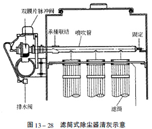 由于濾芯本身是一個(gè)硬固體,不再配置骨架,所以濾芯的清灰與傳統(tǒng)的濾袋清灰不同。圖13—28所示是用一個(gè)脈沖閥噴吹三個(gè)排在一起的濾芯。濾芯的總過(guò)濾面積應(yīng)有限制。