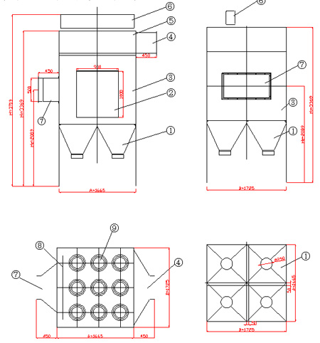 3、設(shè)備外形尺寸見附圖及尺寸表。我公司還可根據(jù)用戶現(xiàn)場場地情況設(shè)計符合用戶要求外形的除塵器。