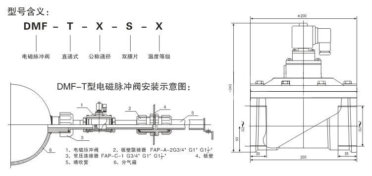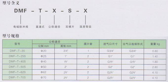 DMF-T型電磁脈沖閥為直通閥,其進氣口之間夾角為180°(進出口中心線為同一直線),其進口與儲氣筒連接,出口與噴吹管連接。氣流暢通,能提供符合要求的清灰氣脈沖。