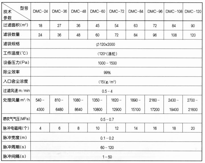 DMC型脈沖袋式倉頂除塵器 DMC型脈沖袋式倉頂除塵器適宜布置在各種粉料貯存庫的頂部,用于捕集各種細小干燥非纖維粉塵。 主要技術(shù)參數(shù): DMC型脈沖袋式倉頂除塵器主要技術(shù)參數(shù)見表,在選型時應(yīng)注意入口粉塵濃度,在技術(shù)性能上,透過濾袋的氣流速度(即過濾風