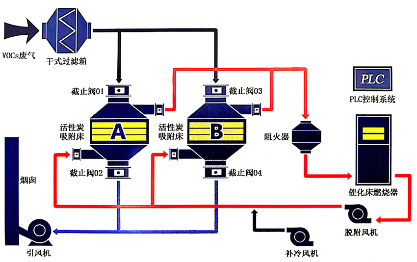 活性炭吸附脫附•催化燃燒裝置是根據(jù)吸附(效率高)和催化燃燒(節(jié)能)兩個基本原理設(shè)計,采用雙氣路連續(xù)工作,一個催化燃燒室,兩個或多個吸附床交替使用。先將有機廢氣用活性炭吸附,當(dāng)快達到飽和時停止吸附,然后用熱氣流將有機物從活性炭上脫附下來使活性炭再生;脫附下來的有機物已被濃縮(濃度較原來提高十倍以上)并送往催化燃燒室催化燃燒成二氧化碳及水蒸氣排出。當(dāng)有機廢氣的濃度達到2000PPm以上時,有機廢氣在催化床可維持自燃,不用外加熱。燃燒后的尾氣一部分排入大氣,大部分被送往吸附床,用于活性炭再生。這樣可滿足燃燒和吸附所需的熱能,達到節(jié)能的目的。再生后的活性炭可進入下次吸附;在脫附時,凈化操作可用另一個吸附床進行,既適合于連續(xù)操作,也適合于間斷操作。