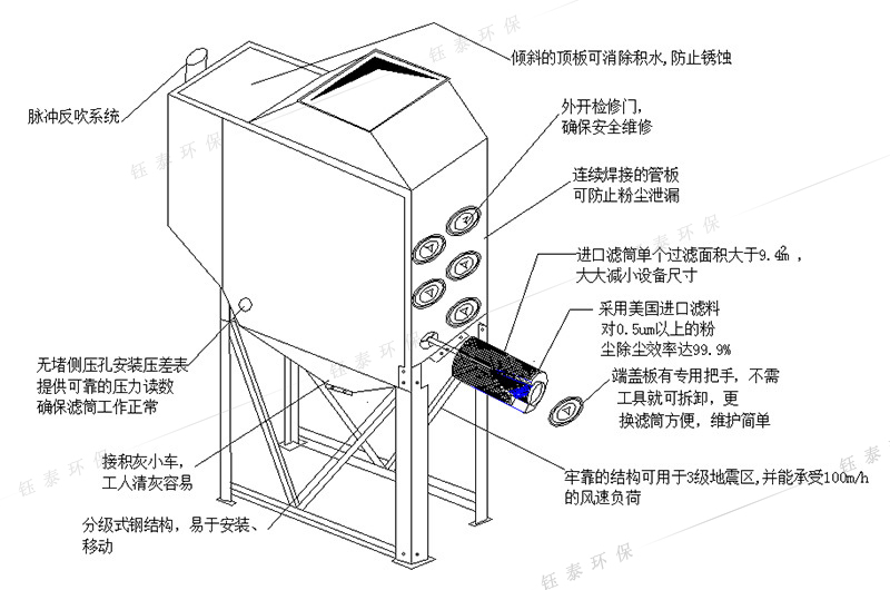 2.1、設(shè)備外型結(jié)構(gòu)特點:整體結(jié)構(gòu)嚴(yán)密,連續(xù)焊接的管板可防止粉塵的泄露。設(shè)備機體采用酸洗除銹,底漆、面漆采用環(huán)氧漆噴涂,環(huán)氧漆附著力強,涂膜柔韌耐磨,耐化學(xué)腐蝕性能優(yōu)良,有極好的耐水、耐油、耐酸堿、耐溶劑性。