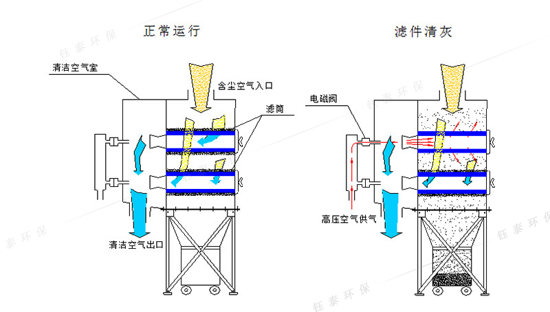 濾筒除塵器的主要構(gòu)造是由除塵室、脈沖反吹清灰系統(tǒng)和集塵室組成。當(dāng)含塵空氣進入除塵室后,被圓筒形的濾筒材質(zhì)阻隔,亞微米以上的粉塵被阻留在濾筒外表面上,過濾凈化后的氣流就從濾筒