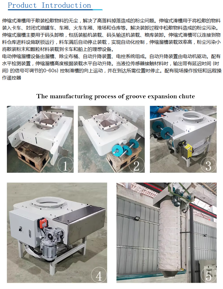 服務(wù)電話:13091153069(同微信)伸縮式卸料管是一種物料處理設(shè)備,用于將粉末和干散狀物料無(wú)塵地裝入或卸入容器、卡車(chē)和船只。它是一種自動(dòng)化且靈活的解決方案,可以根據(jù)不同行業(yè)的需求進(jìn)行定制。伸縮式卸料管系統(tǒng)的主要功能是通過(guò)垂直的鐵管利用物料自身的重量排放粉末或顆粒狀散裝固體,同時(shí)通過(guò)外層的一層帆布材料的布筒收集卸料時(shí)產(chǎn)生的粉塵。為了適應(yīng)上部排放點(diǎn)和下部裝載點(diǎn)之間的不同高度,鐵管被設(shè)計(jì)為可伸縮的。鐵管的靈活性是伸縮式卸料管系統(tǒng)的關(guān)鍵特性,它允許根據(jù)不同的排放和裝載點(diǎn)進(jìn)行調(diào)整,使其成為廣泛應(yīng)用的多功能解決方案。