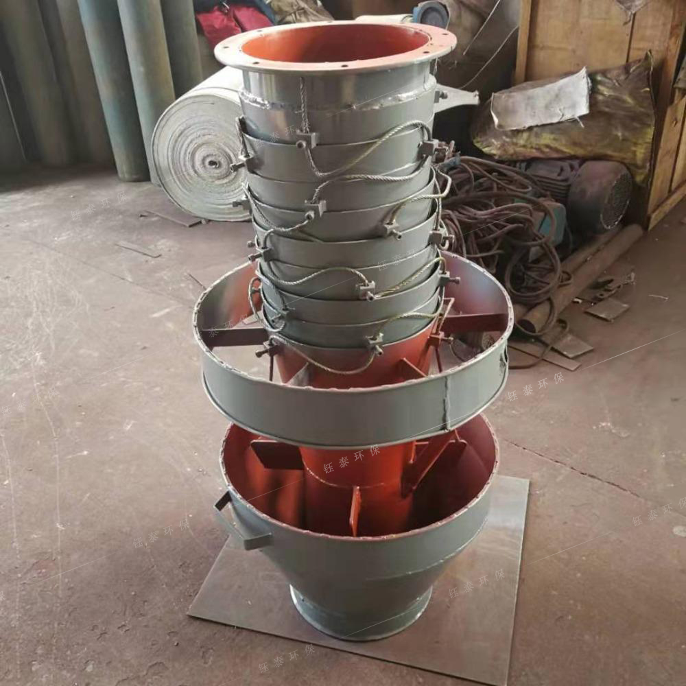 制作外伸縮布袋方式:要求伸縮布袋上每2個相鄰漲圈之間的垂直間距必須≤10cm,見圖1。當外伸縮布袋折疊后2個相鄰漲圈之間的布袋向內(nèi)褶皺時,不能阻擋住與內(nèi)直鋼套筒外壁之間形成的環(huán)形負壓吸塵通道的橫截面,從而降低負壓吸塵的通過量??蛻羰褂矛F(xiàn)場反饋漲圈間距大的吸塵氣流明顯比漲圈間距小的吸塵氣流更加順暢。
