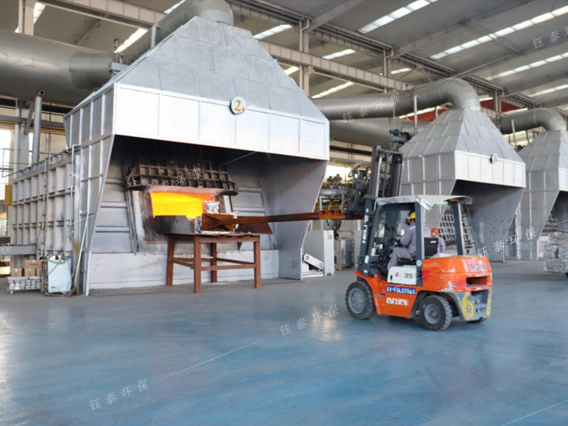 再生鋁雙室爐煙氣處理系統(tǒng)采用XLP高效旋風(fēng)除塵器+強(qiáng)制排風(fēng)冷卻器+脈沖布袋除塵器組成,雙室爐爐門排煙采用2個排煙罩,2個爐門罩交替打開;并配套爐膛排料輔助排煙系統(tǒng),1套雙室爐煙氣處理系